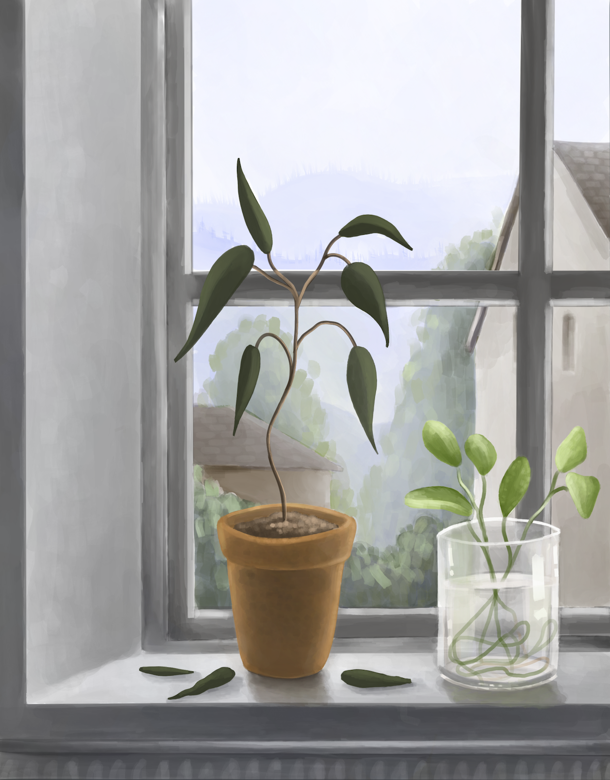 This piece was an assignment created for a color theory course at Las Positas Community College. Produced digitally on ProCreate, I wanted to experiment with the concept of mortality, and depict life and death through plant cycles. On the left, we see a shriveled, darker-colored plant appearing to be on the brink of dying, contrasted to the brighter-colored plant on the right, which is at the beginning of its life cycle, still growing in its glass enclosure. While these two plants are meant to show the contrast between life and death next to one another, they are also meant to suggest how one state of life can contribute to the other, and how they can go hand in hand. For the background, I wanted to create a somber but peaceful scene to tie into my concept, filled with muted, cool-toned colors, and foggy skies. This also suggests the beautiness and serenity that life can be, even in death. By choosing to focus on plants in order to convey the concept of mortality, I aimed to highlight the quiet durability and inescapable transformation of nature, and how it connects us as humans to all living things.